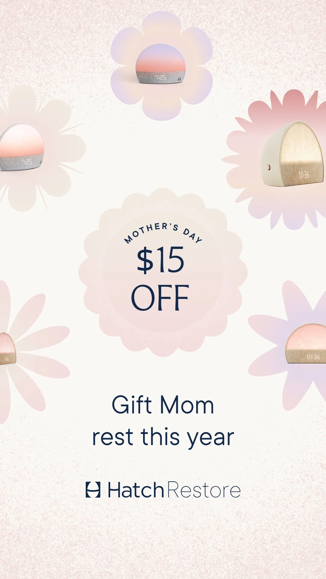 Art direction and design for Hatch’s Mother’s Day campaign. A discount code of $15 off was offered with the goal to increase sales of their adult products: the Restore Classic and the Restore 2. The campaign was targeting new prospects, existing prospects with no registered devices and customers who had Hatch’s kids products but not a Restore.