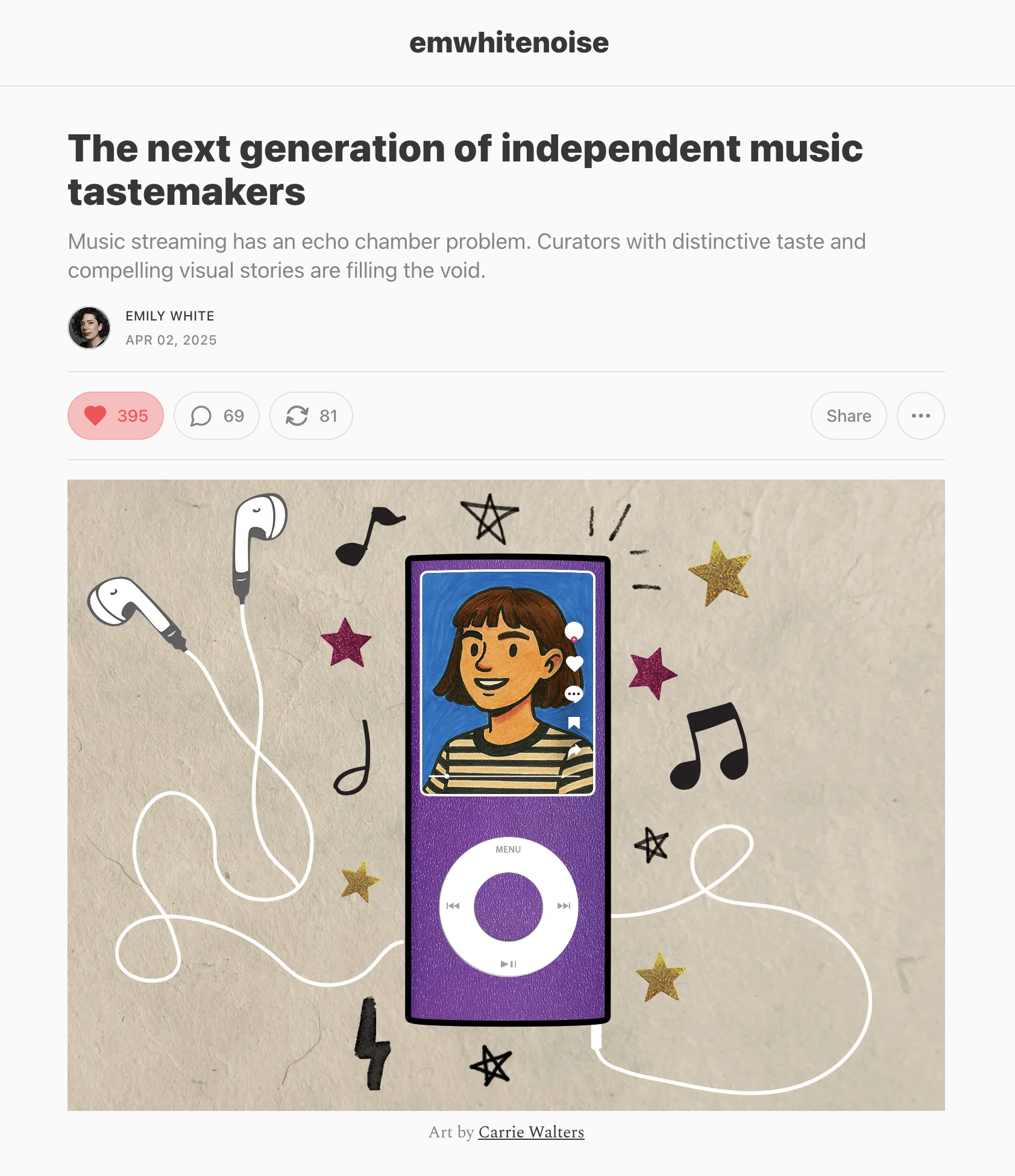 Emily and I met through college radio, and later became close while working in music in New York. What I’ve always loved about her perspective is that she approaches the industry through the lens of fandom and culture, something I think a lot of music writers lose touch with once they're on the inside. For her Substack, we wanted the visuals to feel personal and a little zine-like. She referenced her iPod Nano from high school, a time when music discovery felt more intimate and self-directed, and that became the anchor for the visual direction.
