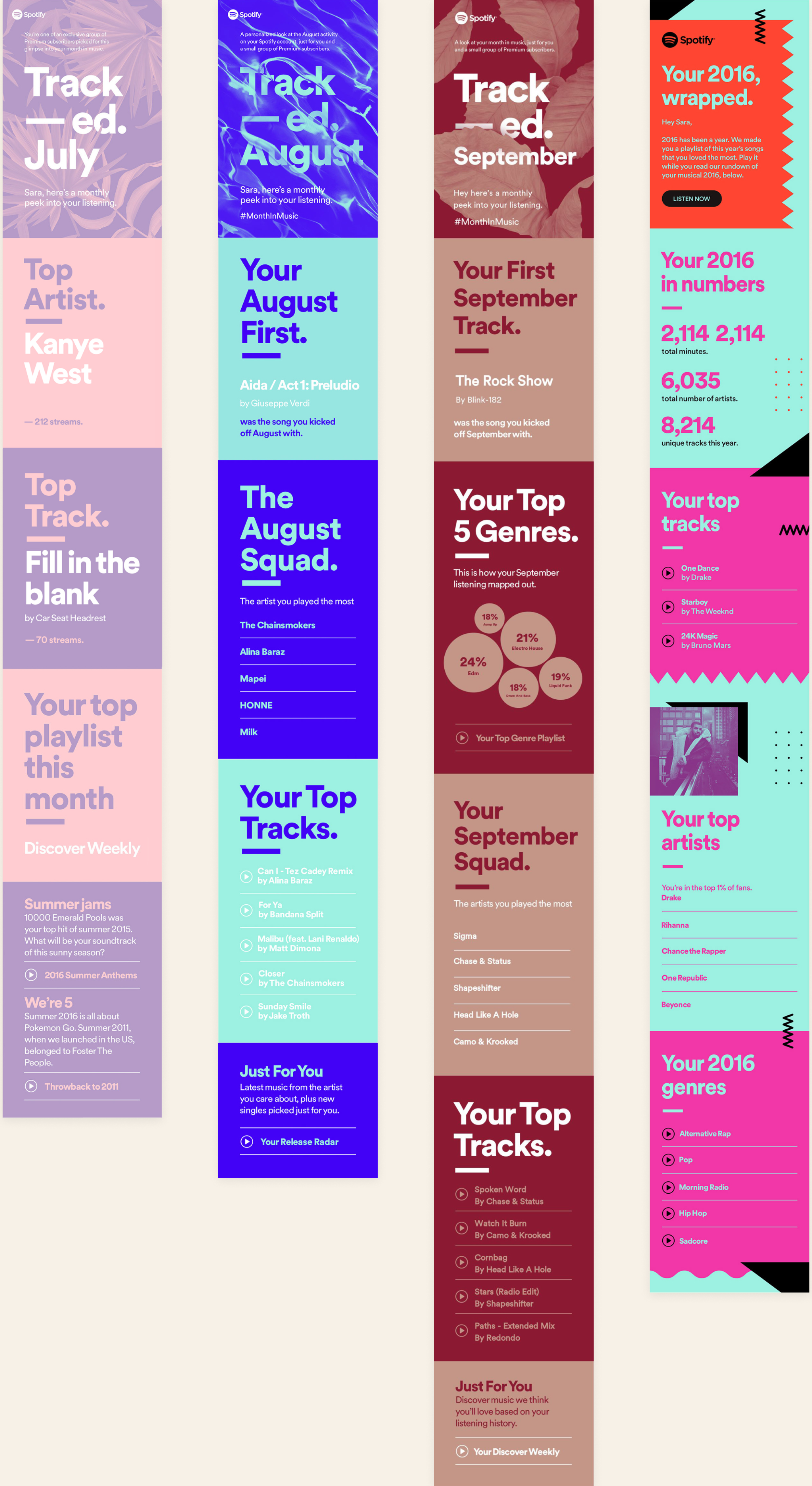 Tracked was a serialized lifecycle email series that transformed monthly listening data into narrative. I built a flexible system that balanced automation with emotion across a three-month pilot, laying groundwork for what would later become Spotify Wrapped.