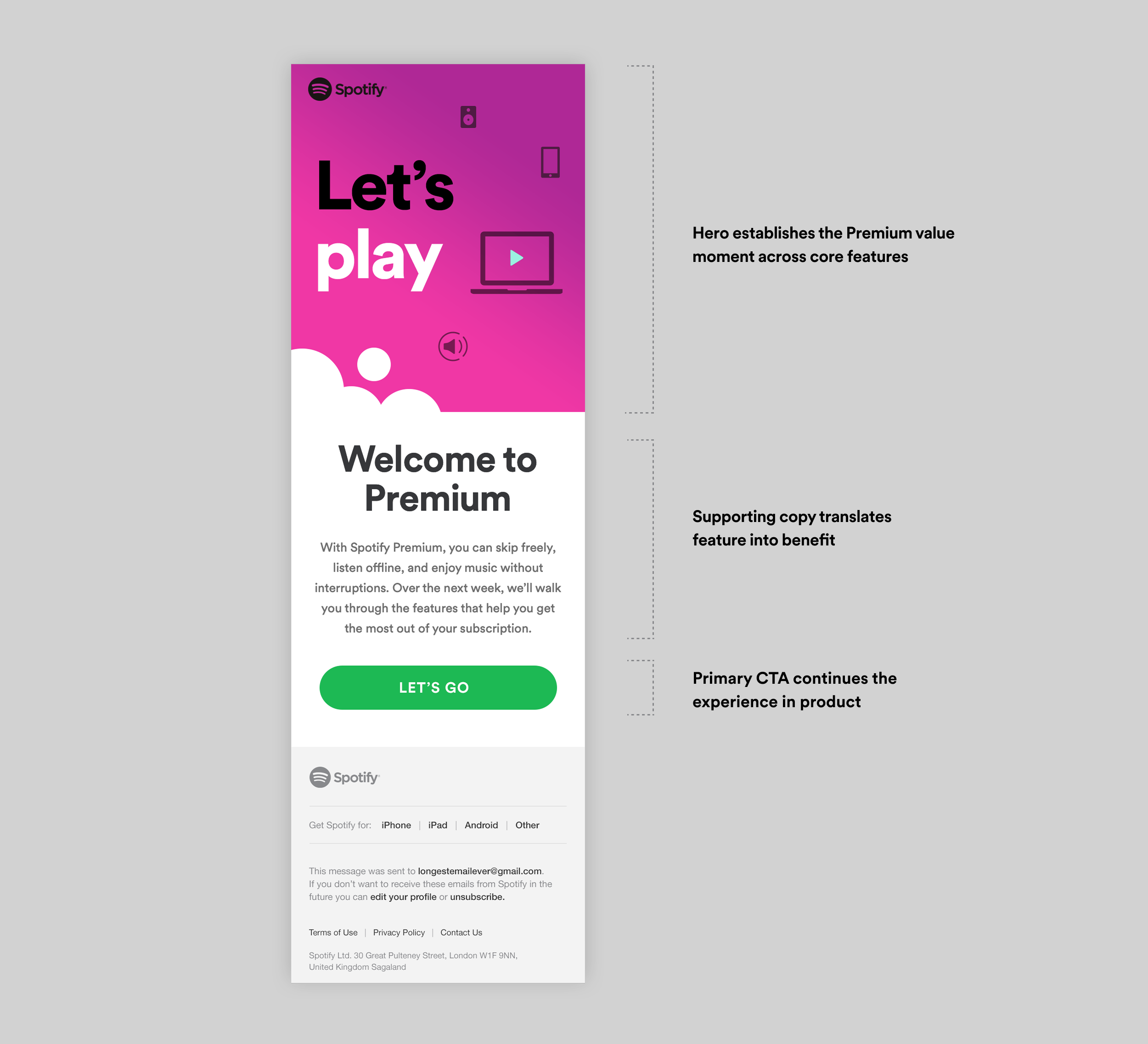 A seven-day animated lifecycle series designed to reinforce the value of Spotify Premium at the moment of conversion. Each email introduced a key feature through a motion system built for scale and localization across global markets.
