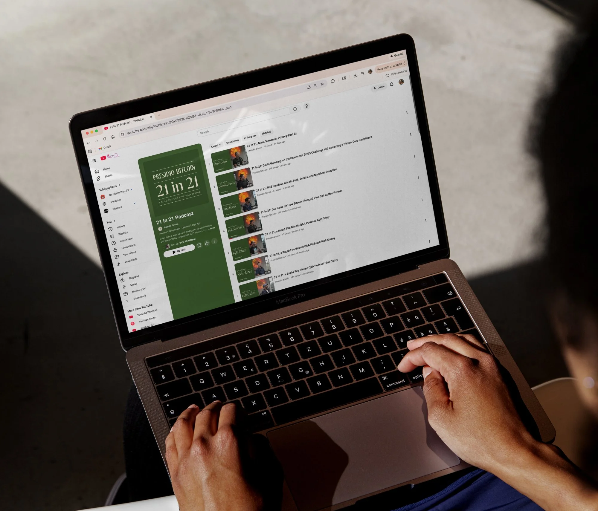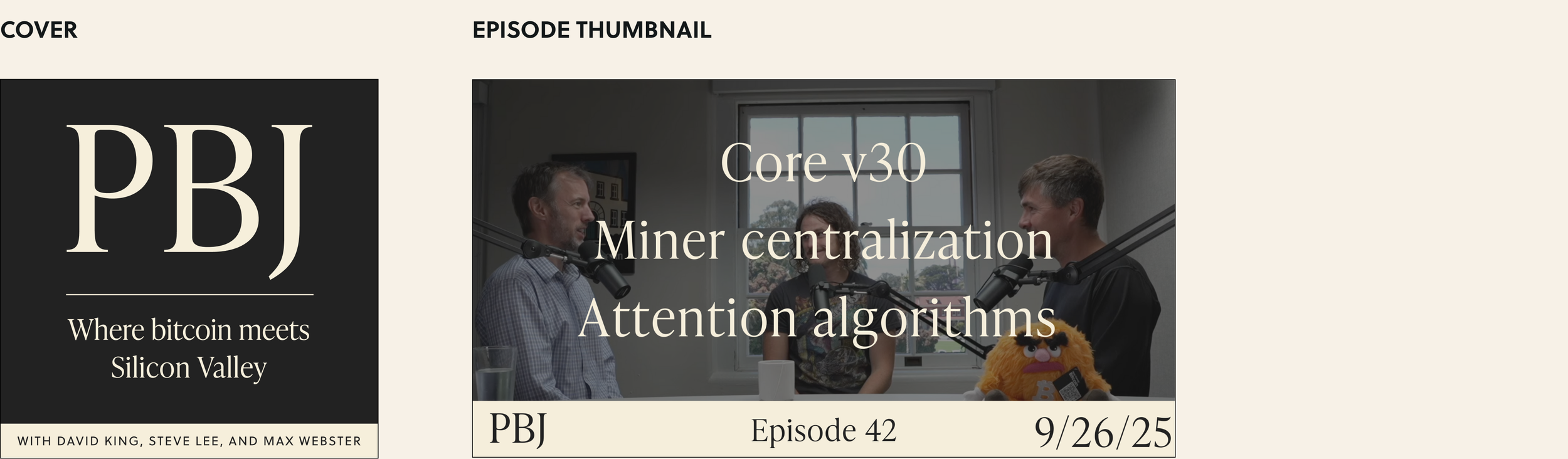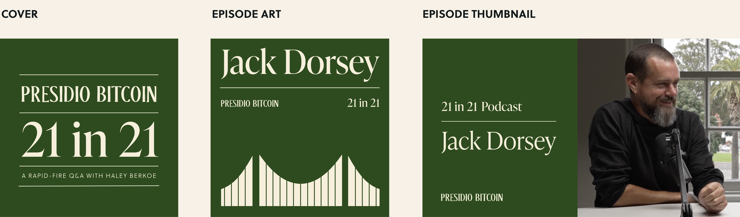 Presidio Bitcoin hosts two in-house podcasts: 21in21, a rapid-fire Q&A featuring leaders from Bitcoin and Silicon Valley, and Presidio Bitcoin Jam (PBJ), a weekly roundtable on current Bitcoin topics. I designed the visual systems for both shows, including cover art and episode and thumbnail templates. The designs draw from the typography and hierarchy of Presidio signage.