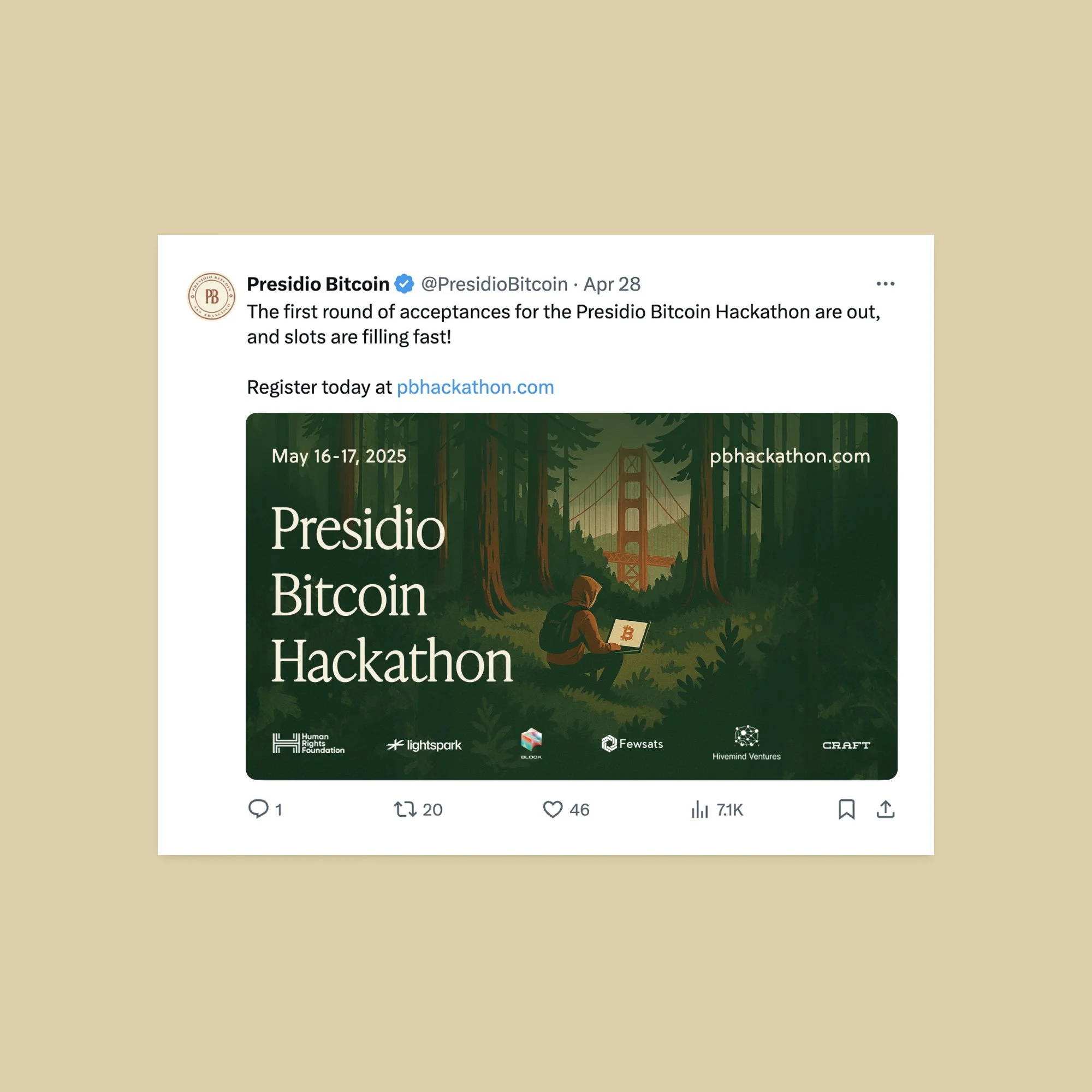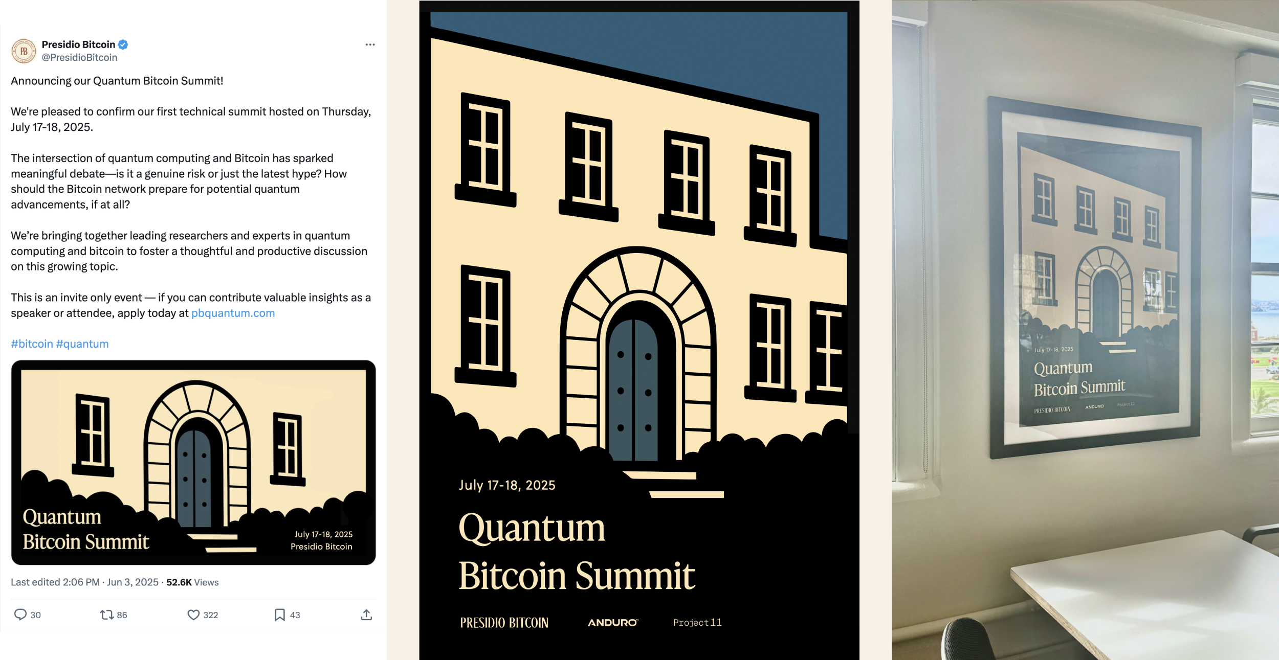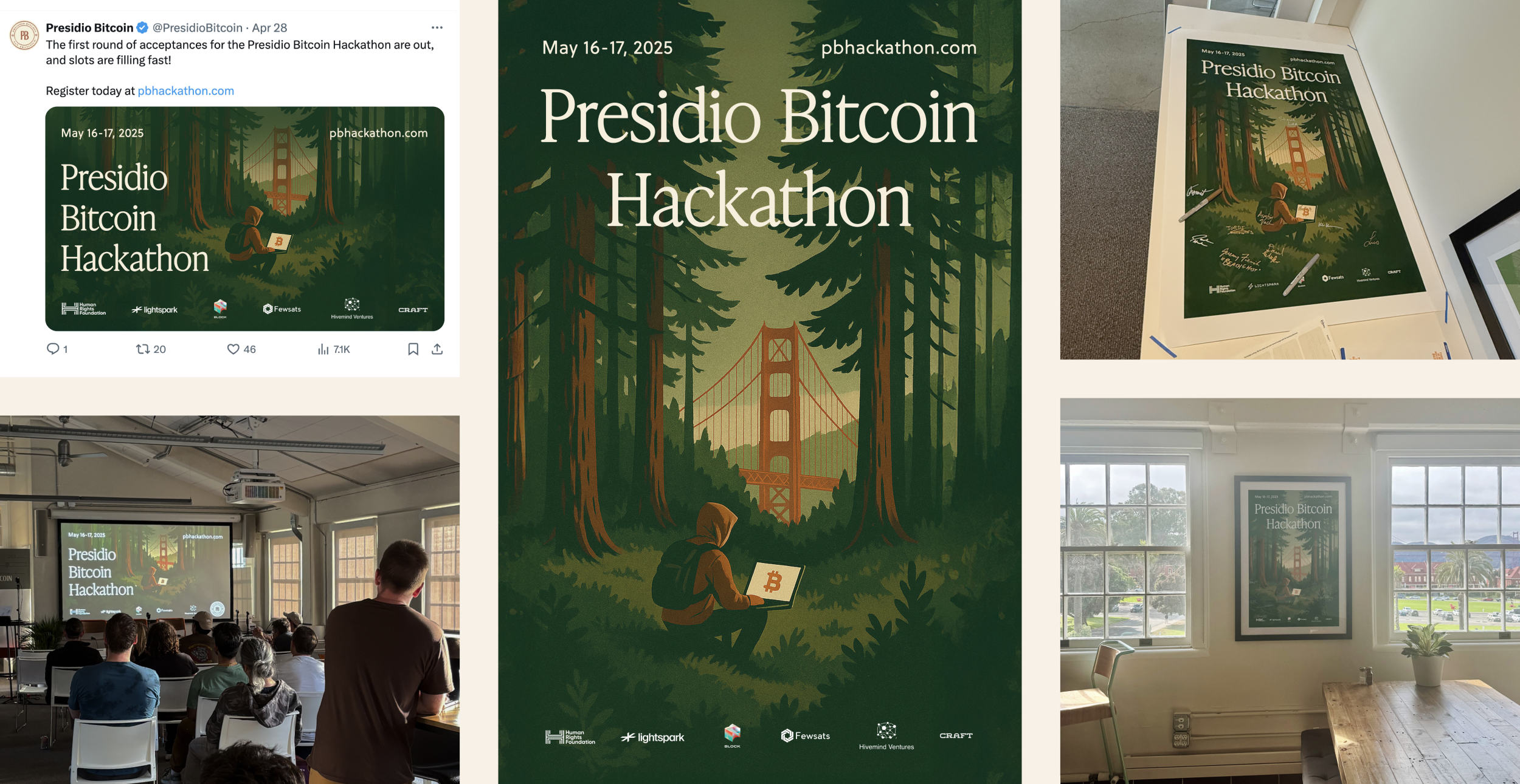 I lead creative direction for Presidio Bitcoin’s hackathons, summits, and community events, developing a poster-led system used across physical spaces and digital channels.
